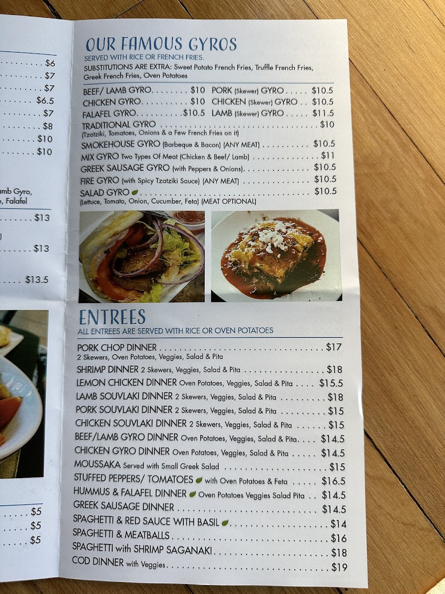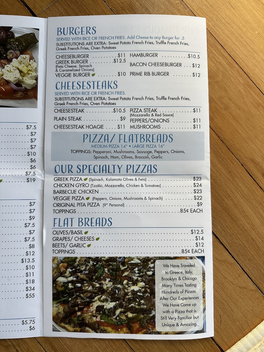The menu aligns well with the welcoming atmosphere of the restaurant, inviting guests to enjoy familiar Mediterranean tastes alongside some pizza favorites, making it suitable for both quick bites and relaxed dining. Whether stopping by for a comforting gyro sandwich or settling in for a full dinner, the food reflects a balance of fresh, vibrant ingredients and satisfying portions that fit everyday enjoyment.